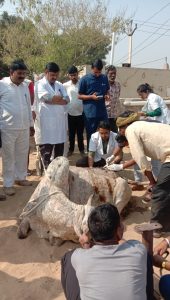 बीकानेर 14 फरवरी। वेटरनरी विश्वविद्यालय, बीकानेर एवं पशुपालन विभाग, बीकानेर के संयुक्त तत्वावधान में राज्य सरकार की 100 दिन की कार्य योजना के अंतर्गत बुधवार को डूंगरगढ़ तहसील के दुलचासर गांव में पशुचिकित्सा शिविर का आयोजन किया गया। निदेशक क्लिनिक डॉ. प्रवीन बिश्नोई ने बताया कि पशुचिकित्सा शिविर के माध्यम से पशुओं में फैलने वाली विभिन्न संक्रामक बीमारिया, गायनेकोलॉजिकल एवं सर्जिकल समस्याओं का निवारण किया गया। शिविर के दौरान कुल 262 पशुओं को ईलाज किया गया जिसमें से 190 पशुओं को कुपोषण एवं अन्तः परजीवियों से बचाव हेतु मिनरल मिक्सचर एवं कृमिनाशक दवा दी गई। शिविर के दौरान पशुपालन विभाग के संयुक्त निदेशक डॉ. एस.पी. जोशी उपस्थित रहे। शिविर के आयोजन में पशुचिकित्सा एवं पशु विज्ञान महाविद्यालय, बीकानेर के मेडिसिन विभाग के सहायक आचार्य के डॉ. जे.पी. कच्छावा, पशु शल्य चिकित्सा विभाग के डॉ. सुरेश कुमार झीरवाल, पशु प्रसुति एवं मादा रोग विभाग के डॉ. अशोक कुमार, वेटरनरी पेरासाईटोलॉजी विभाग के डॉ. पी.के. पिलानियां, पशुपालन विभाग, बीकानेर के डॉ. संजय शर्मा, डॉ. सुभाष घारू, डॉ. सुनील परिहार, डॉ. उत्तम सिंह व पी.जी. एवं इर्न्टस विद्यार्थियों ने अपनी सेवाएं प्रदान की।