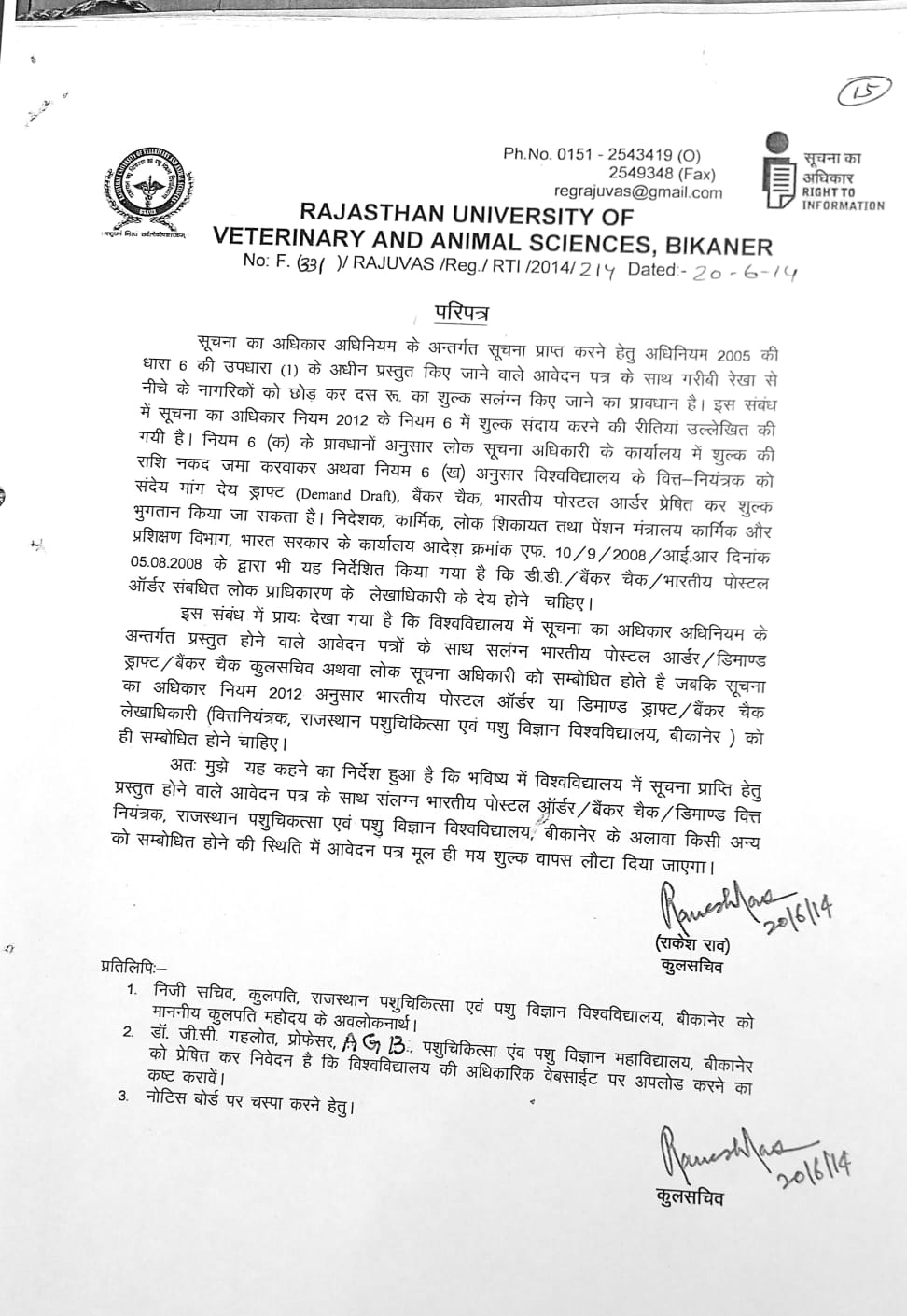 In compliance to the direction from H.E. the Governor & Chancellor vide No. F. 1 (9)/RB/2013/4409 dated 17 May, 2013 and in supersession of this office No. F. (59)/RAJUVAS/Reg./2011/1707 dated 22.03.2012, the Registrar, RAJUVAS, Bikaner shall act as Public Information Officer under Right to Information Act-2005.